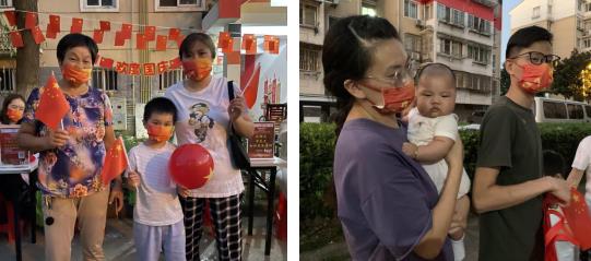 樓棟門口,五星紅旗隨風(fēng)飄揚(yáng),在“歡度國慶”的標(biāo)語下,路過的居民們積極參與到知識(shí)問答活動(dòng)中。社區(qū)準(zhǔn)備了印有“我愛祖國”字樣的紅色國慶口罩、國旗、國慶氣球組成的慶國慶小禮包,送給參加活動(dòng)的大朋友、小朋友們。