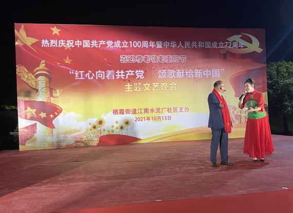 為慶祝中國共產(chǎn)黨成立100周年暨新中國成立72周年,喜迎尊老敬老重陽節(jié),10月13日,棲霞街道江南廠社區(qū)在黃泥山大廣場舉辦“紅心向著共產(chǎn)黨 頌歌獻給新中國”主題文藝晚會。