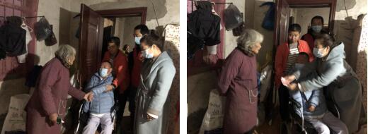 小分隊(duì)于11月26日下午6點(diǎn)順利抵達(dá)灌南,此時(shí)天已經(jīng)完全黑了,在當(dāng)?shù)刂驹刚叩膸ьI(lǐng)下連夜到當(dāng)?shù)匚繂柪щy群體,在去往第一戶家庭的路上,由于車輛不能完全開到家中,需要步行幾百米的泥濘小路,君子老師在幾名志愿者的配合幫助下抵達(dá)受助群體家中。這是一位80多歲高齡的孤寡老人,平時(shí)都靠鄰居照顧,工作人員詳細(xì)了解老人近期身體狀況,耐心詢問家里的生活困難,并送上了冬被、大米、牛奶,機(jī)構(gòu)曹老師還送上了慰問金,老人看到君子老師坐在輪椅上還來幫助自己,深受感動(dòng),臨走時(shí)緊握君子老師和曹老師雙手,眼眶閃爍著淚花,激動(dòng)地說:“感謝你們來看望我!”。