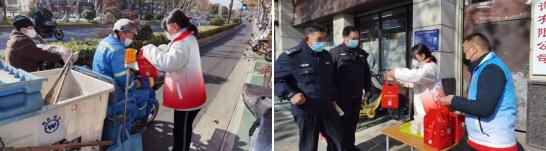 工作人員們帶著餃子和其他慰問品來到戶外,支起桌子,為環(huán)衛(wèi)工、民警、外賣小哥送去。紅通通的袋子中,熱騰騰的手工餃子,蘊含著真誠和祈愿,為戶外工作者送上一份感謝、一份祝福,一份冬日里的溫暖。