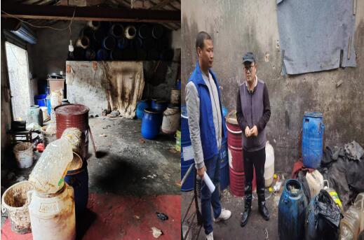 網(wǎng)格員楊勇在日常巡查小段山工業(yè)園時(shí),發(fā)現(xiàn)道路上有兩條不尋常的車輪印且油跡閃亮。循著油跡方向,楊勇來到一座緊閉大門的院子,楊勇懷疑那可能是一個(gè)小作坊,敲開院門,一股刺鼻的油煙味撲面而來,隨之映入眼簾的是兩個(gè)工人、一臺(tái)機(jī)器在熱火朝天的工作,地面上散放著幾十個(gè)油桶,有的是裝滿泔水,有的是渾濁的油,典型的地溝油加工作坊。楊勇立即報(bào)告村委會(huì),聯(lián)系相關(guān)執(zhí)法部門,依法依規(guī)地取締了該處地溝油作坊。