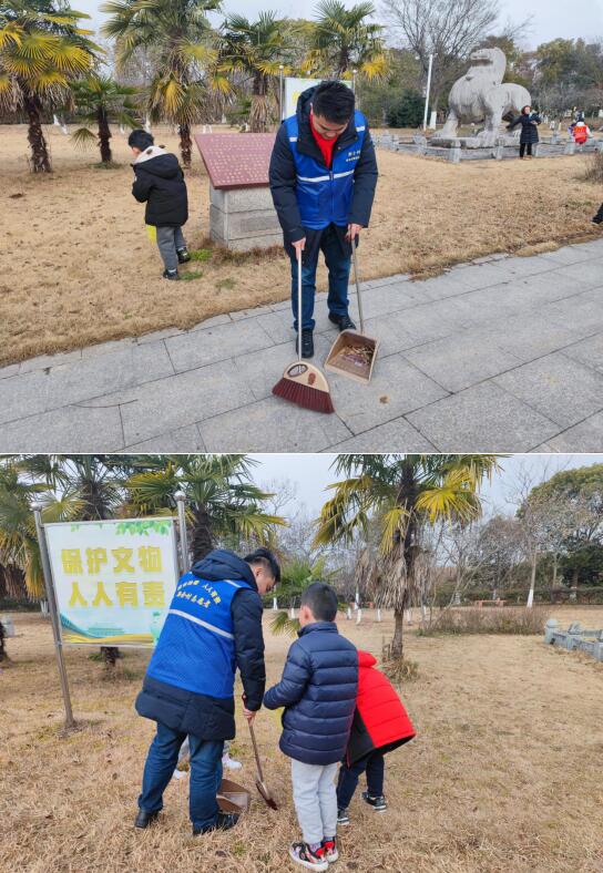 活動中,城市治理志愿者和孩子們不畏嚴(yán)寒,他們干勁十足,紛紛拿起笤帚等工具積極行動,重點(diǎn)對蕭恢墓石刻、十月村毛主席雕像周圍散落的塑料袋、飲料盒、煙頭等生活垃圾進(jìn)行撿拾,本次共清理出各類垃圾5袋,經(jīng)過清理,兩處文物周邊環(huán)境得到了明顯改善。