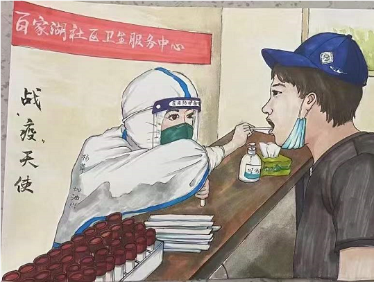近日,南京市江寧區(qū)秣陵街道牛首社區(qū)工作人員在太平南苑全員核酸檢測點位進行核酸檢測時收到轄區(qū)小朋友收的宣傳畫,畫上一名“全副武裝”的大白,正在為面前的一位居民做核酸檢測,畫里記錄的場景這些天里重復(fù)在各個核酸檢測點位上演著。