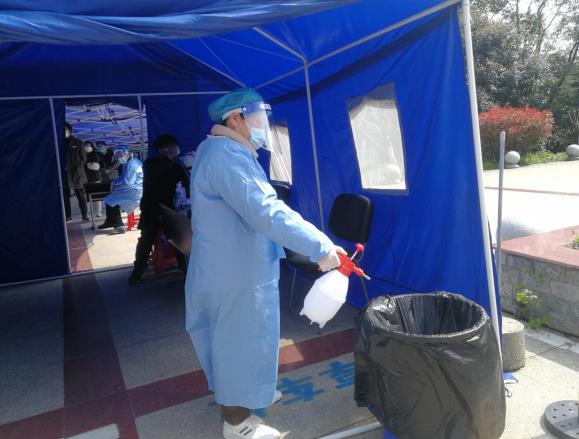 面對嚴(yán)峻的疫情形勢需要,三個多月來,孟枝平每天都堅持上崗,持續(xù)工作十幾個小時。就在前幾天,孟枝平母親離世,她要送上一程,放不下手中工作的她,只請了幾個小時的假,很快就又回到了崗位上。為了有效阻斷病毒的傳播,核酸現(xiàn)場每隔一小時就要消毒一次,她拖著殘疾的腿認(rèn)真仔細(xì)打掃衛(wèi)生,將每一個角落都消毒到位。