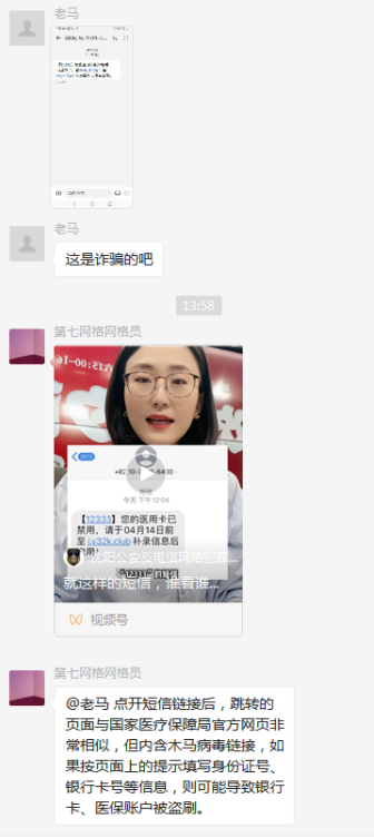 近日,家住金桂園的居民馬先生在“掌上云”網(wǎng)格群內(nèi)詢(xún)問(wèn)自己收到的是否為詐騙短信,短信顯示“您的醫(yī)用保險(xiǎn)卡暫時(shí)無(wú)法報(bào)銷(xiāo)”并附有信息完善鏈接。網(wǎng)格員當(dāng)即制止,并告知馬先生,這是短信詐騙,通過(guò)誘導(dǎo)居民點(diǎn)擊釣魚(yú)網(wǎng)址鏈接,更新完善資料,進(jìn)行銀行卡賬戶(hù)盜刷,從而實(shí)施詐騙。
