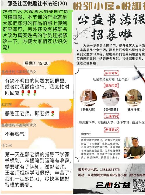 為豐富和活躍社區(qū)居民的精神文化生活,讓居民感受中國(guó)的傳統(tǒng)文化,近日,南京市江寧區(qū)東山街道邵圣社區(qū)聯(lián)合南京市會(huì)心社會(huì)工作服務(wù)中心開(kāi)設(shè)悅?cè)ど鐣?shū)法班,由社區(qū)志愿者書(shū)法家郭秀文老師為大家授課,報(bào)名的居民從30歲到70歲,老中青三代學(xué)員匯聚一堂,共同感受書(shū)法的魅力。