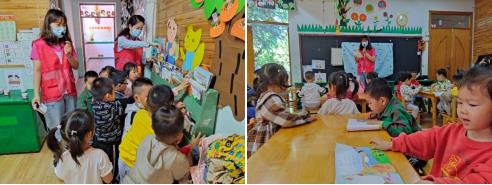 幼兒園教室里設有圖書角,志愿者精心挑選了一些精彩、經典的繪本故事放在其中供孩子們自行挑選。簡單的文字、生動的插圖、動人的情節(jié),無一不吸引著孩子們的注意力,大家迫不及待地讀起繪本,打開一扇觀察世界的大門。現(xiàn)場,志愿者還向孩子們介紹繪本故事,并邀請孩子講述自己喜歡的選段,分享喜歡的理由和讀后的感想,在分享互動中充分鍛煉他們的閱讀、理解、表達能力。
