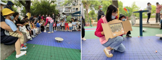 活動現(xiàn)場,陳曦老師拿出《小蟲子球球》的立體讀本,聲情并茂地向小朋友們講述著小蟲子球球的冒險之旅,“看,這次小蟲子球球遇到了什么危險呢?”在陳曦老師的帶動下,小朋友們漸漸沉浸到故事當(dāng)中,積極與老師互動,幫助小蟲子球球度過一次又一次危險。故事結(jié)束后,小朋友們還在熱烈地討論著,“小蟲子球球好勇敢呀!”“我也要像小蟲子球球那樣幫助別人。”
