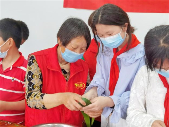 在熱鬧的氛圍中,孩子們在志愿者的指導(dǎo)下,一起學(xué)習(xí)包粽子。折疊粽葉、放入糯米和紅豆,再系上繩子,一個(gè)個(gè)圓滾滾的小粽子也完成了。