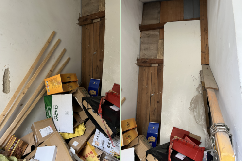 社區(qū)領導得知情況后,對此事高度重視,秉持著對違建絕不姑息的態(tài)度,迅速做出反應。聯(lián)合小區(qū)物業(yè)管理處,安排工作人員現(xiàn)場核實,發(fā)現(xiàn)通道處被木板封堵,其中堆放著各種雜物,儼然成為了“私人倉庫”。