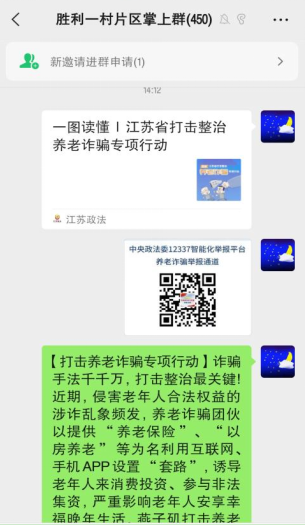 線上,電瓷社區(qū)網(wǎng)格員通過網(wǎng)格微信群積極推送關(guān)于防范“養(yǎng)老詐騙”相關(guān)文章,擴(kuò)大網(wǎng)絡(luò)宣傳覆蓋面,教育引導(dǎo)老年人提高自我安全防范能力和意識(shí)。線下,社區(qū)網(wǎng)格員通過張貼橫幅、設(shè)置電子屏等方式,并用通俗易懂的話語,向老年人詳細(xì)講解養(yǎng)老詐騙手段的作案特點(diǎn)、防范方法等,揭露養(yǎng)老詐騙“套路”,幫助老年人提高法治意識(shí)和識(shí)騙、防騙能力。