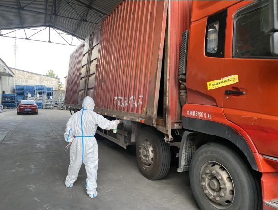 新合村企業(yè)服務(wù)中心按上級要求,對轄區(qū)企業(yè)涉及物流進出的車輛進行報備并統(tǒng)一管理,特別是上海等中高風(fēng)險區(qū)車輛實行預(yù)約登記。在交通卡口初檢完成后,由引導(dǎo)員配合企業(yè)對外車輛,特別是上海車輛進行消殺,在司機全程不下車的情況下,企業(yè)安排人員進行貨物裝卸,裝卸全部完畢以后,再由引導(dǎo)員原路駛出轄區(qū),實施全流程閉環(huán)管理。
