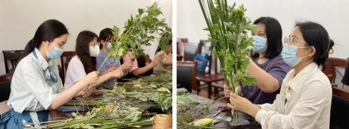 活動的現(xiàn)場散發(fā)著陣陣艾草的清香,給在場的居民們都帶來了美好的心情。大家一起學習了解了有關端午節(jié)的一些知識,對于今天要制作的艾草花束也有初步的認知。緊接著,大家邊看示范,動手包起手中的艾草花束。先折彩紙,分艾草,接著把多余的葉子剪掉,再用紅繩捆綁,最后包花束,在各個居民的巧手下艾草被精心裝扮,一堆堆艾草變成了一束束既好看又能驅蟲辟邪的花束。在制作過程中,大家遇到了問題也會互相討論,不知不覺中,每個人之間的距離慢慢拉近了?;顒釉谝黄瑲g聲笑語中到了尾聲,大家互相展示了自己的成品,分享了各自在制作中的感悟。