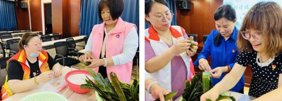 此次活動邀請了社區(qū)里會包粽子的老人、居民與志愿者一起為老人包制粽子,志愿者阿姨熟練地將粽葉折成錐形、放糯米和蜜棗,最后折疊粽葉、用棉線捆扎,在志愿者們齊心協(xié)力下,三角形、喇叭形、背包形、長條形……各式各樣的漂亮粽子在志愿者的手中成型。志愿者們有序分工,有的包粽子、有的整理粽葉、有的扎粽子、有的煮粽子,耗時兩個多小時,200多只粽子大功告成。