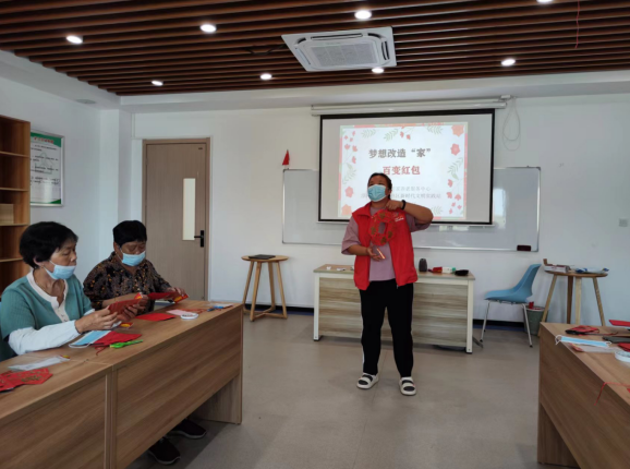 本次活動(dòng)的主要內(nèi)容是改造家里擱置的紅包,通過大家的巧手,把紅包變成精美的裝飾品。志愿者向大家展示了由紅包做成的燈籠,好看又實(shí)用的燈籠激發(fā)了居民們濃厚的興趣和熱情。大家圍坐在一起,跟著志愿者的步驟積極動(dòng)起手來,還不時(shí)相互討論、仔細(xì)揣摩折疊手法,兩型課堂里充滿了濃厚的學(xué)習(xí)氛圍。