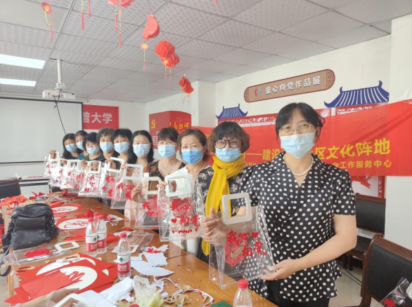 剪紙是古老的民間藝術(shù),也是非物質(zhì)文化遺產(chǎn),接下來的剪紙環(huán)節(jié),中前社區(qū)巧妙地將剪紙藝術(shù)與紅色文化相結(jié)合。“我們先剪下帶有紅色元素的鏤空剪紙,一枚黨徽、一個愛心等都可以,然后將其貼在透明包上。”在剪紙藝人的現(xiàn)場教授下,大家拿起剪刀和彩紙,開始了動手實踐,將對黨的深切情誼通過剪紙表達(dá)出來。
