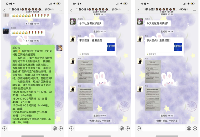 社區(qū)相關(guān)事宜的通知、社區(qū)新時代文明實(shí)踐站的相關(guān)活動及困難補(bǔ)助名單的公示等,都會在這一平臺上告訴給居民們。如疫情防控以來,社區(qū)每輪的核酸檢測和疫苗的流動核酸車接種時間安排,社區(qū)工作人員都會通過平臺讓居民能夠快速知曉。近期還推送了露天電影通知、南京市醫(yī)保信息平臺升級遷移工作等其他通知。