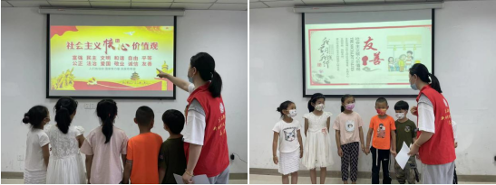 活動(dòng)現(xiàn)場,志愿者為小朋友們進(jìn)行社會(huì)主義價(jià)值觀教育,著重像小朋友們介紹了友善這一概念。“友善,是社會(huì)的潤滑劑,能夠讓人與人之間的關(guān)系和睦,減少很多摩擦和不必要的麻煩,有助于社會(huì)團(tuán)結(jié),有助于社會(huì)進(jìn)步。”在志愿者的講解下,小朋友們紛紛表示要將“友善”融入生活的方方面面。