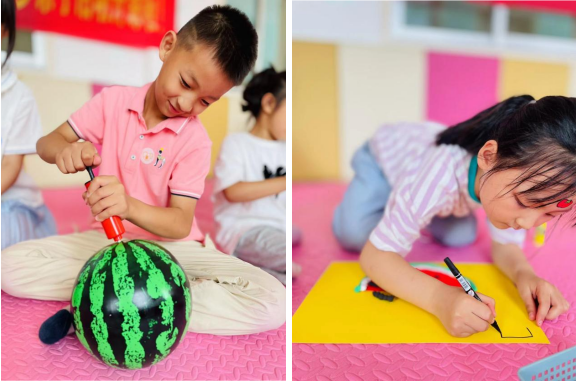 除了講故事,活動(dòng)的另一個(gè)“重頭戲”便是動(dòng)手環(huán)節(jié)。老師布置了充西瓜球和畫西瓜的小任務(wù),并為每一個(gè)孩子發(fā)放了充氣筒以及繪畫工具。現(xiàn)場(chǎng)指揮大家為西瓜型玩具球充氣。孩子們一個(gè)個(gè)手拿充氣筒便開始了嘗試,有的小朋友力氣小,西瓜球也小,但是在老師和家長(zhǎng)的不斷鼓勵(lì)下,最終完成了游戲任務(wù),他們充滿自豪的向大家展示著自己的西瓜球。在畫西瓜的過程中,孩子們都很認(rèn)真,將西瓜小心翼翼的貼在黃色的卡紙上,并寫下自己的名字。