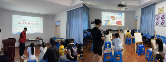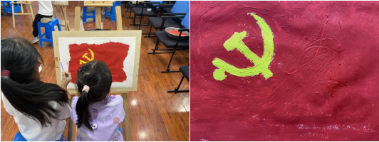 “誕生于南湖游船,猶如天際升起的朝陽。歷經(jīng)滄桑的祖國,如同沉睡的雄獅,在您耀眼的光芒下,猛然睜開了雙眼……”活動伊始,家長和孩子們共同朗誦了詩歌《黨在我心中》,回顧了黨百余年來的風(fēng)雨征程,謳歌了黨百折不撓的偉大精神。接著,孩子們直抒胸臆,暢所欲言,他們表示課本里學(xué)習(xí)過的劉胡蘭、董存瑞的英雄事跡和不屈精神常常鼓舞著他們努力奮進(jìn),堅定信念。隨后,孩子們進(jìn)行最后一項繪畫活動,他們通過手中的彩筆繪出向黨的心,結(jié)合“神舟十四號”而作的七彩火箭表達(dá)了對神秘太空的好奇,姐妹聯(lián)手繪制的黨旗則寓意著黨是我們的引路明燈。