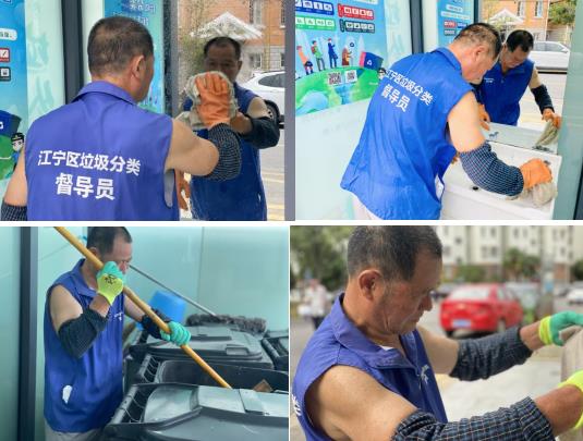 “我退休了,平時在家閑著,就來做垃圾分類指導員了,已經(jīng)做了近2年了。”何成喜這樣介紹道。每天早上5點多,他便到達了工作崗位,依次進行清洗沖刷垃圾桶、廂房內(nèi)外消毒、廂房水池擦洗、地面清洗、在規(guī)定廂房口擺放垃圾桶等工作流程。“我每天來的早,先把衛(wèi)生打掃好,這樣居民們來投遞垃圾也更方便。”夏天時溫度高,垃圾容易滋生細菌產(chǎn)生異味,何成喜一邊和社工聊天一邊將廂房里里外外都進行了消毒。