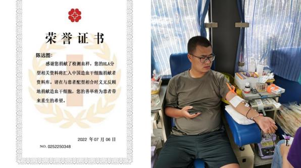 “感謝您捐獻(xiàn)了檢測(cè)血樣,您的HLA分型相關(guān)資料將匯入中國(guó)造血干細(xì)胞捐獻(xiàn)者資料庫(kù)。請(qǐng)?jiān)谂c患者配型相合時(shí)義無(wú)反顧地捐獻(xiàn)造血干細(xì)胞,您的善舉將為患者帶來(lái)重生的希望。”這是南京市江寧區(qū)淳化街道新林村民兵陳遠(yuǎn)圖同志在獻(xiàn)血后收到的榮譽(yù)證書。