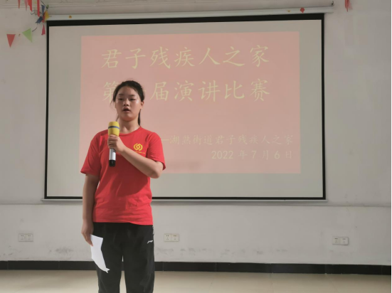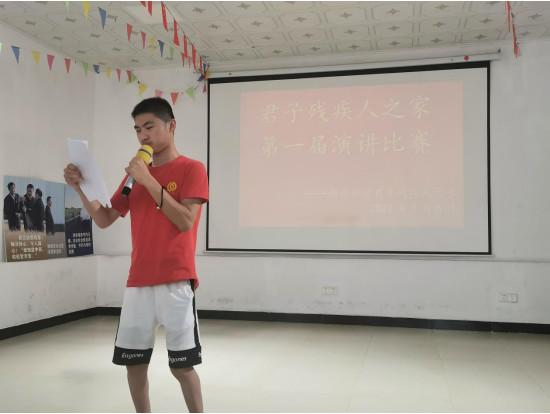 為進一步推動機構(gòu)的發(fā)展,激發(fā)學生的演講興趣,給學生提供一個鍛煉自我、展示自我、捕捉機遇的舞臺。2022年7月6日上午九點整,南京市江寧區(qū)湖熟街道君子殘疾人之家隆重舉辦了“君子殘疾人之家 第一屆演講比賽”,此次比賽分為三個環(huán)節(jié),分別為自我介紹、講述故事以及才藝表演,學員們紛紛拿出了自己的強項,將整個演講發(fā)揮得淋漓盡致!