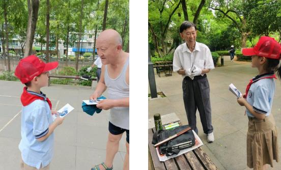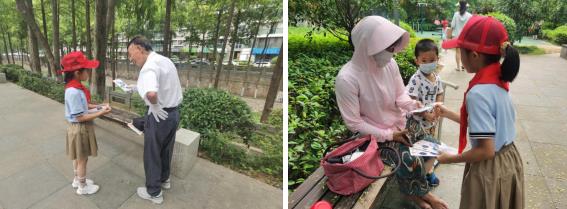 隊(duì)員們?cè)趨f(xié)會(huì)志愿者的幫助下,制作了節(jié)水知識(shí)宣傳頁(yè),他們走到公園里、道路上,給周圍居民講解節(jié)水知識(shí),分發(fā)宣傳單頁(yè)。