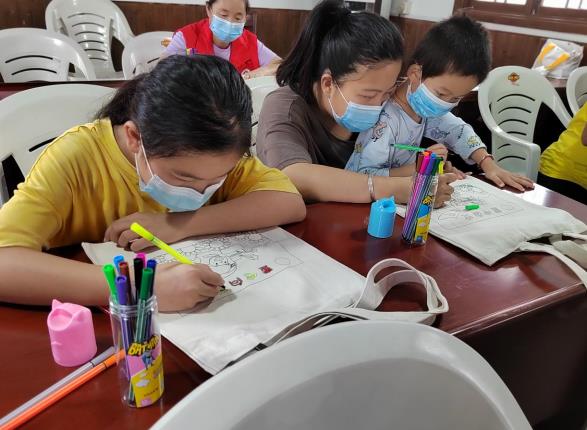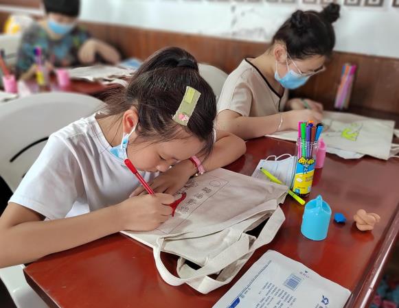 手繪環(huán)節(jié),大家拿起各色顏料細(xì)致涂抹,紅的綠的黃的白的顏料在靈巧的雙手間生成七彩斑娟的、符合畫(huà)面的顏色,慢慢地帆布包開(kāi)始生動(dòng)、鮮活起來(lái)。孩子們用色彩鮮明的顏色、耐心細(xì)致地繪出對(duì)祖國(guó)的熱愛(ài)。看著自己的成果,大家的臉上都露出燦爛的笑容。