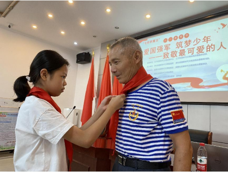 宣講結(jié)束后,青少年代表為退役老兵張爺爺佩戴上鮮艷的紅領(lǐng)巾,為他送去節(jié)日的祝福,并莊嚴(yán)承諾,在未來的學(xué)習(xí)之路上將沿著先輩們的足跡,滿懷信心,努力奮斗,實現(xiàn)中華民族偉大復(fù)興的強(qiáng)國之夢。