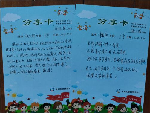 活動結(jié)束后,一位家長在分享卡中寫到:老師講解耐心有愛,小孩喜歡參與并樂在其中,我們會多多參與,也希望社區(qū)能多多舉辦。還有家長寫到:很開心在我們社區(qū)為了孩子舉辦的活動,即豐富了孩子們的假期生活,又讓孩子們學到各種知識。小游戲,吸引孩子的注意力,提高他們的專注力。社區(qū)的子在一起,也可以認識不同的小朋友,擴大他們的“朋友圈”。這樣的活動多多益善。感恩!