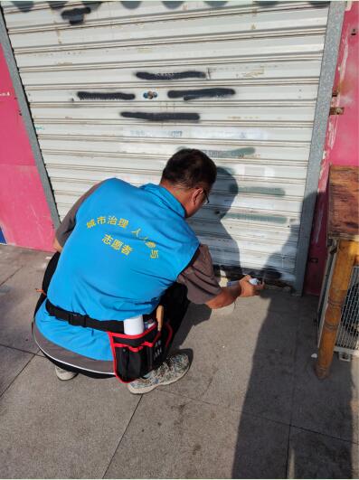 在轄區(qū)內(nèi)百水橋路臨街商業(yè)街上,城市治理志愿者正在有條不紊的清理著卷簾門上的牛皮癬小廣告,他們拿著抹布、掃把、漆鏟等工具,認(rèn)真對(duì)電線桿、卷簾門、墻面、信報(bào)箱等設(shè)施上張貼的各類小廣告進(jìn)行逐一清理,力求不漏一處地把牛皮癬小廣告清理干凈。雖然已汗流浹背,志愿者也沒(méi)有絲毫的馬虎,他們?cè)谇謇?ldquo;牛皮癬”的同時(shí),還積極向居民宣傳清潔衛(wèi)生知識(shí),希望居民攜起手來(lái)共同治理此類不文明現(xiàn)象。