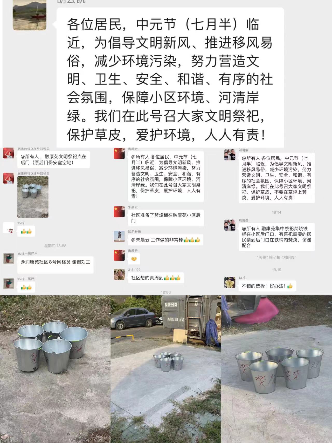 中元節(jié)臨近,為倡導文明新風、推進移風易俗,減少環(huán)境污染,努力營造文明、衛(wèi)生、安全、和諧、有序的社會氛圍,8月11日下午,南京市棲霞區(qū)馬群街道潤康苑社區(qū)在小區(qū)指定位置準備祭祀焚燒桶,號召大家愛護環(huán)境,文明祭祀。