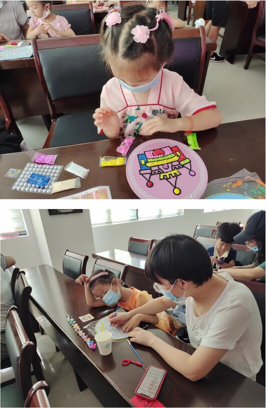 炎炎夏日擋不住孩子們的熱情,他們?cè)缭鐏?lái)到社區(qū)活動(dòng)室?;顒?dòng)中,老師給孩子們?cè)敿?xì)介紹了扇子的由來(lái)、扇子制作材料的變遷,以及扇面繪畫的簡(jiǎn)單技巧等。同時(shí)為孩子們準(zhǔn)備了空白扇子、五彩繽紛的顏料和種類齊全的繪畫工具,給他們普及扇子繪畫的方法和技巧。隨后,孩子們各自挑選了自己喜歡的繪畫圖案,拿起畫筆小心翼翼地沿著圖案線條進(jìn)行涂色,不一會(huì)兒,一幅幅豐富多彩的扇子畫就呈現(xiàn)在大家面前,他們有的畫城堡,有的畫蛋糕,還有的畫小動(dòng)物……孩子們都非常喜歡自己的畫作,滿臉笑容地拿起扇子和家長(zhǎng)們分享展示。