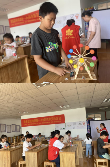 接下來(lái),志愿者又向小朋友們?cè)敿?xì)講解并示范了摩天輪制作步驟。孩子們嘗試著一步步進(jìn)行拆零件、組裝,安裝過(guò)程中遇到問(wèn)題大家也一起互相之間進(jìn)行探討研究,互幫互助。最后在彼此的共同努力下,每個(gè)孩子都成功完成了屬于自己的“作品”,大家同時(shí)啟動(dòng)開(kāi)關(guān),五顏六色的風(fēng)輪轉(zhuǎn)動(dòng)起來(lái)漂亮極了,一張張稚嫩的小臉蛋洋溢著自豪的笑容。