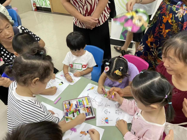 首先,社區(qū)志愿者帶領(lǐng)兒童閱讀繪本書籍《神奇雨傘店》,此繪本講述了一只小豬在樹林里遇到了一家神奇的雨傘店的故事,孩子們認(rèn)真聆聽者志愿者的講述。暖場(chǎng)時(shí)間,兒童跟著志愿者學(xué)習(xí)了幼兒韻律手指謠《下雨了》。繪本共讀過程,鼓勵(lì)小朋友們觀察圖片中的細(xì)節(jié),預(yù)測(cè)型提問引導(dǎo)小朋友發(fā)揮想象力。拓展部分,每個(gè)小朋友都動(dòng)手用蠟筆給自己的神奇雨傘涂了色,加強(qiáng)了孩子對(duì)于雨傘、形狀以及顏色的認(rèn)知,鍛煉了寶貝們的手部精細(xì)動(dòng)作?;顒?dòng)結(jié)束,大家都拿著自己的繪畫作品合影留念。
