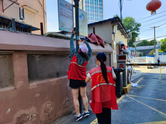 “快看,我找到一處公益廣告卷邊,把膠帶給我,重新固定一下更美觀。”青年志愿者何歆鈺發(fā)現(xiàn)金寧新村小區(qū)2號(hào)門入口處燈桿上的道旗卷邊,現(xiàn)場(chǎng)進(jìn)行整改?;顒?dòng)中,青年志愿者們還對(duì)公益廣告宣傳欄進(jìn)行擦拭清潔,同時(shí),對(duì)過(guò)往居民進(jìn)行文明宣傳,增強(qiáng)他們愛(ài)護(hù)轄區(qū)公共設(shè)施的意識(shí),確保轄區(qū)文明創(chuàng)建宣傳陣地良好形象,讓居民在潛移默化中接受文明的洗禮。
