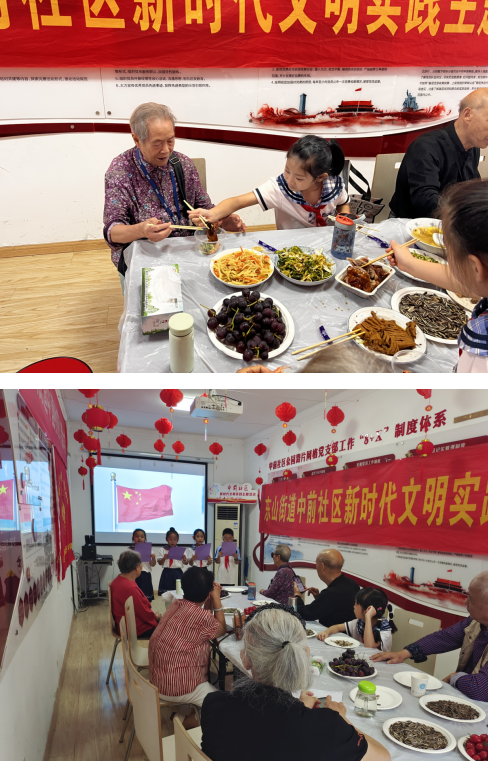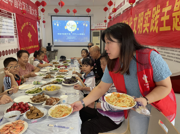 活動前夕,志愿者阿姨忙碌地為獨居老人們準備了紅燒魚、水煮蝦、清炒西蘭花、青椒土豆絲、玉米排骨湯等種類豐富的菜品?;顒蝇F(xiàn)場,少先隊員帶來的表演如詩朗誦《青春禮贊》《會飛的鞋子》、歌曲《春天在哪里》《孤勇者》、相聲《哥倆好》、舞蹈《茉莉情懷》等引得在場的老人們紛紛鼓掌稱贊。老年代表演唱了戲曲和澎湖灣,最后在少先隊隊歌中整場活動落下了帷幕。老人們以及小朋友們圍坐在一起吃團圓宴,談笑風(fēng)生,節(jié)日氛圍十分濃厚。