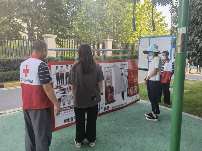 活動中,紅十字志愿者在轄區(qū)內(nèi)布置了宣傳板,向來往居民介紹掌握急救技能的重要性,呼吁更多的居民學(xué)習(xí)急救知識,參與“救在身邊”活動。