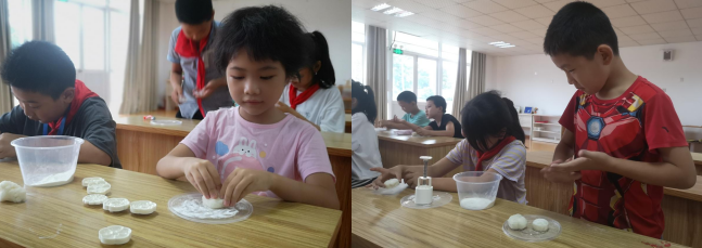 “中秋節(jié)是團(tuán)結(jié)節(jié),中秋習(xí)俗多又多,中秋月餅甜又甜,中秋節(jié)的月餅因?yàn)閳F(tuán)圓這份配料的加入,更加有了甜化心間的溫情。”通過志愿者的介紹,充分激發(fā)起小朋友們對(duì)制作手工月餅的濃厚興趣。小朋友們選擇各自喜歡的月餅?zāi)>撸I(lǐng)取事先準(zhǔn)備好的月餅冰皮材料,揉搓成型,放入模具用力按壓,一只只可愛的兔子,一朵朵美麗的鮮花,一顆顆精美的月餅,就制作完成了。