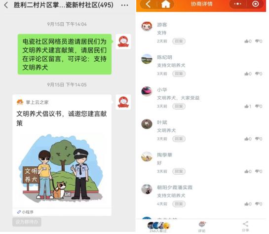 驚擾路人、約束不嚴(yán)、隨意大小便等等不文明養(yǎng)狗行為,不僅困擾著居民的日常生活,還嚴(yán)重影響了社區(qū)日常治理。不少居民還通過“掌上云社區(qū)”向社區(qū)反映不文明養(yǎng)狗行為,希望社區(qū)能夠積極進(jìn)行引導(dǎo),營(yíng)造良好生活環(huán)境。倡議一經(jīng)發(fā)出,得到了社區(qū)居民的一致點(diǎn)贊與支持,“支持!不文明養(yǎng)狗行為就應(yīng)該消除!”“非常支持!這不僅是對(duì)狗狗負(fù)責(zé),還是對(duì)小區(qū)居民負(fù)責(zé)!”