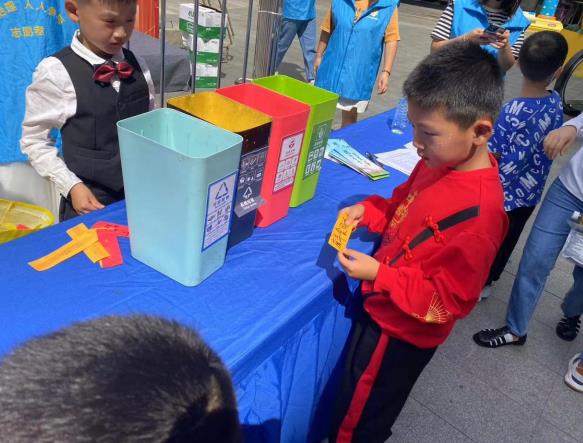 在現(xiàn)場放置有四種垃圾桶:可回收垃圾桶、廚余垃圾桶、有害垃圾桶和其它垃圾桶,并用小紙條寫上不同垃圾的名字,來模擬現(xiàn)實生活中會產(chǎn)生的垃圾。小朋友接到紙條后,根據(jù)紙條上寫的垃圾的名稱,將其正確分類,并投入到對應(yīng)的垃圾桶中,便可得到小毛巾、小梳子等獎品。若未正確分類,一邊的工作人員就會上前教導(dǎo)小朋友正確的分類方法,并耐心告知垃圾分類的相關(guān)知識。