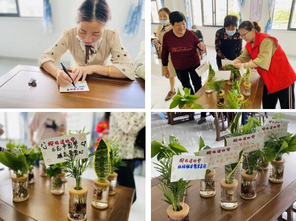 在簽到環(huán)節(jié),成山社區(qū)精心設(shè)計(jì)了“祝福送給黨”的卡片替代原有的紙質(zhì)簽到,使簽名變成了一句又一句樸素但真切的祝福,居民們再將自己親手寫的祝福插入綠植中,意喻著祖國繁榮昌盛。