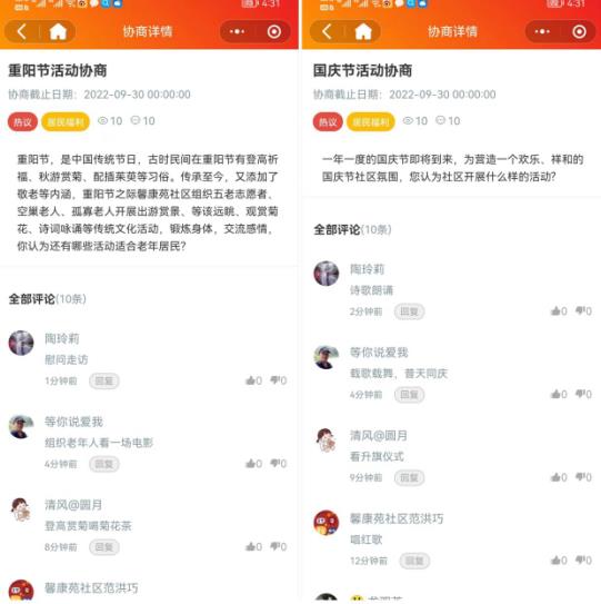 “國(guó)慶節(jié)社區(qū)可以組織觀看天安門升國(guó)旗直播”,“社區(qū)可以組織居民朋友參觀愛國(guó)基地,開展愛國(guó)教育宣傳”,“社區(qū)可以組織居民開展唱紅歌比賽”,“社區(qū)可以開展我為祖國(guó)慶生攝影比賽”,“社區(qū)可以組織居民登高,賞菊,吃重陽(yáng)糕等”,居民朋友們?cè)?ldquo;掌上云”線上協(xié)商版塊積極發(fā)表自己的建議,希望通過自己的建議參與到為祖國(guó)慶生活動(dòng)和重陽(yáng)節(jié)活動(dòng)中去。