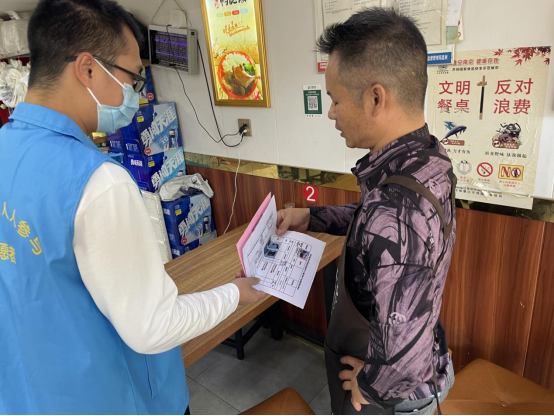 行動(dòng)中,志愿者們來(lái)到花港路沿街門面房,逐戶走入每家商戶,檢查防疫、油煙凈化器清洗情況,提醒商戶佩戴口罩。對(duì)防疫措施不完善的商戶要求現(xiàn)場(chǎng)整改,并提醒商戶及時(shí)清洗油煙凈化器并保存好相關(guān)票據(jù),督促?zèng)]有辦理污水排放許可證的商戶及時(shí)辦理,對(duì)沒有領(lǐng)取門前三包責(zé)任書的商戶提醒其來(lái)社區(qū)領(lǐng)取。