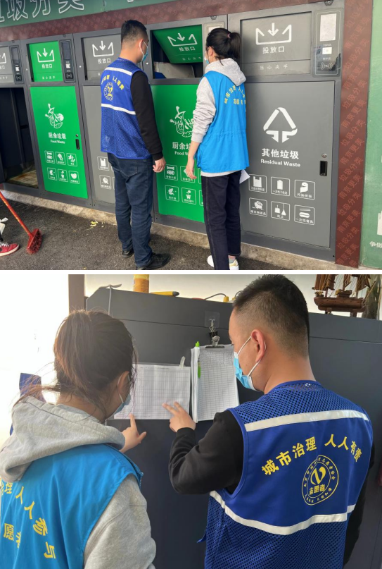 巡查過程中,城市治理志愿者針對每個環(huán)保屋的設(shè)施進行檢查,主要是設(shè)施、垃圾桶衛(wèi)生、有無異味、周邊有無堆放垃圾等情況進行一一檢查,同時對小區(qū)居民進行垃圾分類宣傳,讓分類更精細化更準確。
