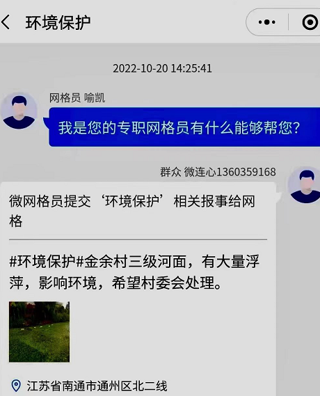 10月20日下午,南通市通州區(qū)金沙街道金余村網(wǎng)格長喻凱收到微網(wǎng)格員在“微連心”小程序上報:“三級河內(nèi)浮萍太多了,影響水面環(huán)境,村里能不能清理清理”?如今,金余村74名微網(wǎng)格員在做好網(wǎng)格內(nèi)本職工作的同時,搖身一變成了人居環(huán)境巡查員。他們對發(fā)現(xiàn)的環(huán)境問題,會第一時間通過“微連心”小程序上報。金余村這段全長16.53公里的三級河,微網(wǎng)格員劉金江每天都會巡查一遍,一旦發(fā)現(xiàn)河坡倒樹、河面攔網(wǎng)等情況,就迅速上報,及早處理。