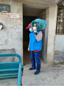 勇當(dāng)防疫“貼心管家”。樓棟長是連接社區(qū)與居家隔離群眾的重要紐帶。為引導(dǎo)群眾做好疫情防護(hù),確保居家隔離市民的日常生活需求。隔離人員因家中煤氣需要更換,便聯(lián)系他們的樓棟長滕師傅,滕師傅毫不猶豫的一口氣到五樓,把幾十斤重的煤氣罐送到隔離人員家門口,順便把隔離人員家中的日常垃圾收走,同時(shí)在門口消毒處理。