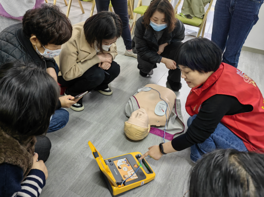 “出門(mén)在外,我們可能會(huì)遇到一些緊急情況,比如有人走在路上突然心臟驟停暈倒,你該怎么辦?”活動(dòng)中,南京市紅十字會(huì)救護(hù)培訓(xùn)中心主任導(dǎo)師,江寧區(qū)紅十字會(huì)救護(hù)培訓(xùn)師張老師結(jié)合自身豐富的急救知識(shí)和實(shí)踐經(jīng)驗(yàn),以形象生動(dòng)的語(yǔ)言、鮮活的事例,圖文并茂地講解了應(yīng)急救護(hù)第一反應(yīng)機(jī)制、心肺復(fù)蘇、海姆立克急救法、創(chuàng)傷救護(hù)、心臟自動(dòng)除顫儀(AED)使用等常見(jiàn)急救知識(shí)。此外,張老師還帶領(lǐng)大家進(jìn)行心肺復(fù)蘇、創(chuàng)傷止血包扎等實(shí)操演練,讓媽媽們更直觀地掌握具體注意事項(xiàng)和操作技巧。