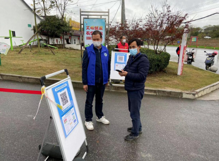003網格員楊勇工作地點在村部核酸檢測點,他負責現場秩序管理和進入大門掃場所碼,同時引導黃碼人員到指定地點采集核酸。